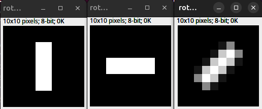 Fig. 33 Interpolation and rotation. (Left) 10 x 10 px original. (Middle) 90 Degree rotation. (Right) 45 Degree rotation bilinear interpolation.#