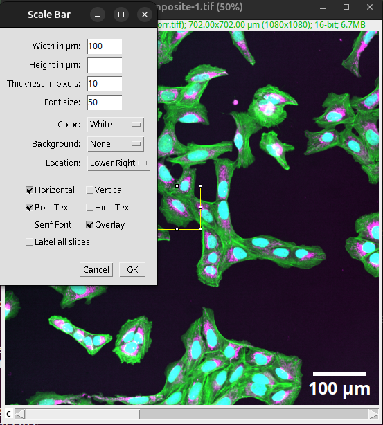 After the correct pixel size has been verified, the scale bar can be created in Fiji via: