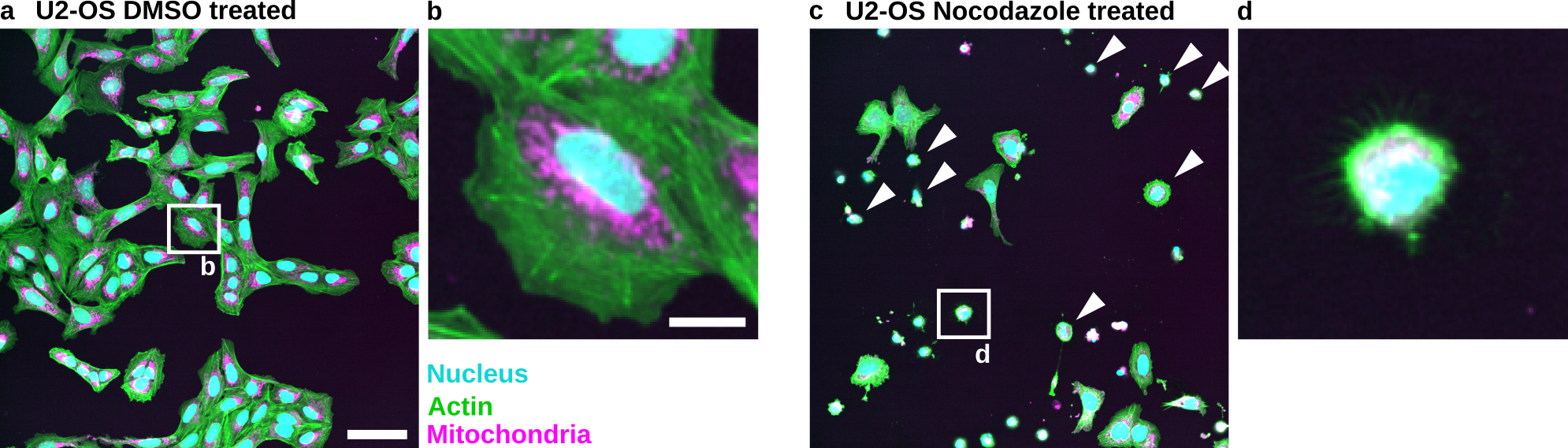 Fig. 51 Nocodazole induces cell death in U2-OS cells: (a) U2-OS cells treated with DMSO only. (b) Cropped image of a single cell treated with DMSO. (c) U2-OS cells treated with Nocodazole at a 5 µM concentration show increased cell death. Note the many small round cells (White Arrowheads). (d) Cropped image of a dead or dying cell. Scale bar represents 100 µm (a) and 20 µm (b).#