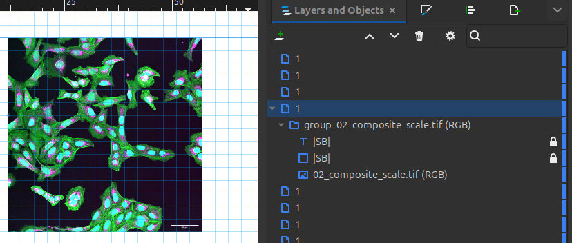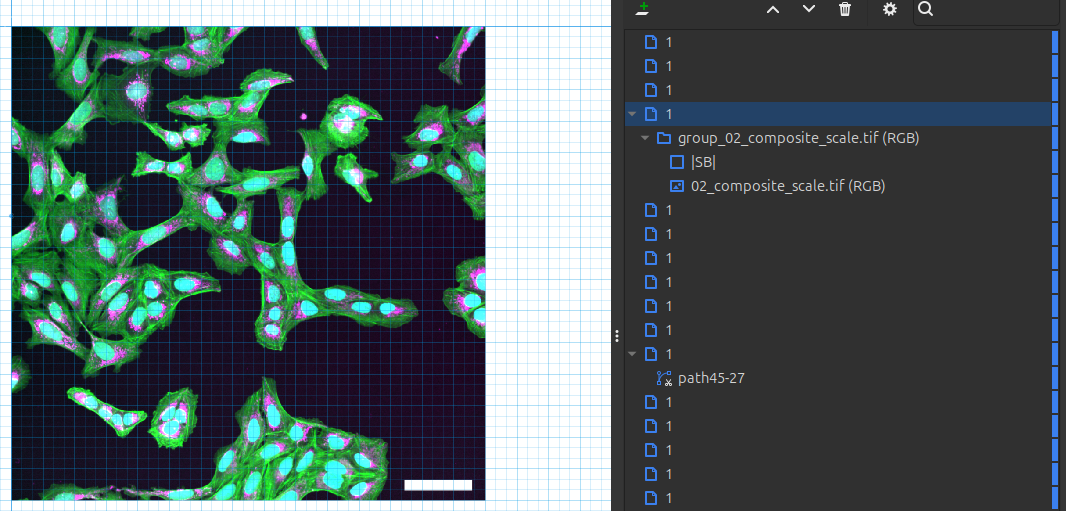 We are now able to load the images exported as SVG into Inkscape. The advantage here is that the images, as well as the included annotations, are full vector graphics. Annotations such as scale bars can be edited, and the images can be resized without interpolation.