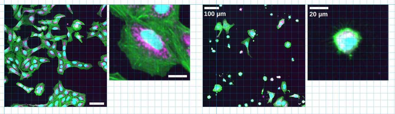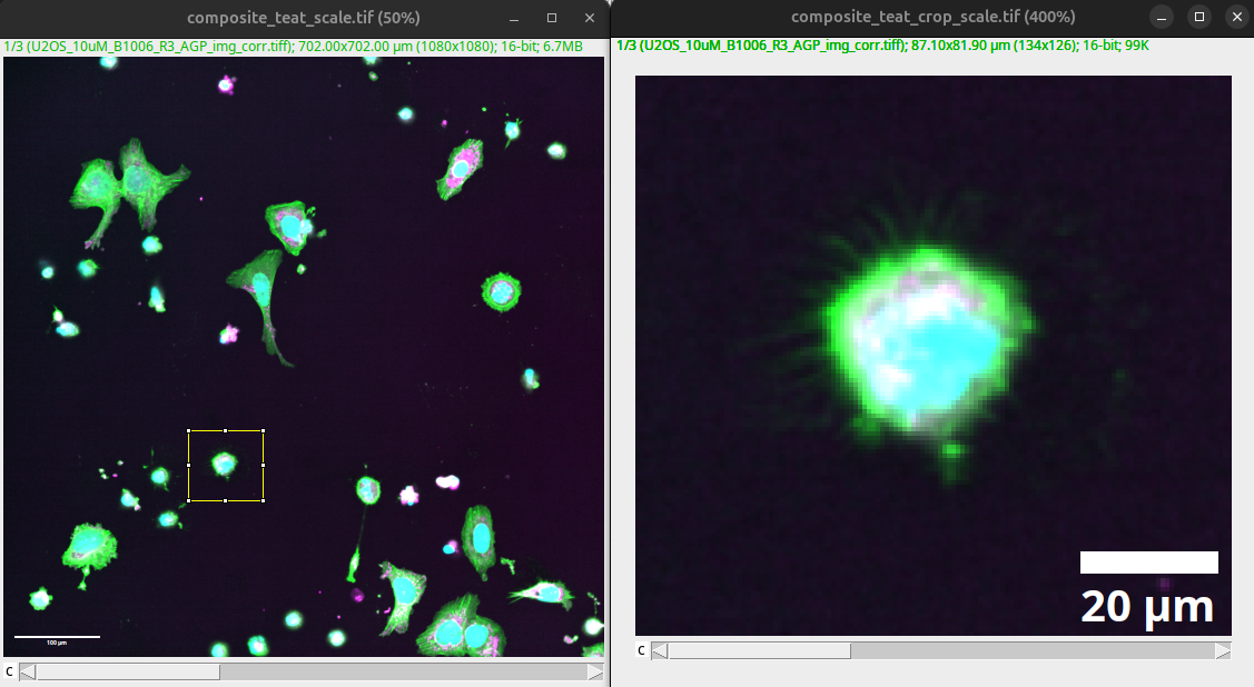 Typically, we want to present other image panels too, for instance, compare wild type versus a treatment. In this case, the first image is of U2-OS cells treated with DMSO as a control. In our example figure, we now want to compare U2-OS cells treated with Nocodazole acquired with the same settings.