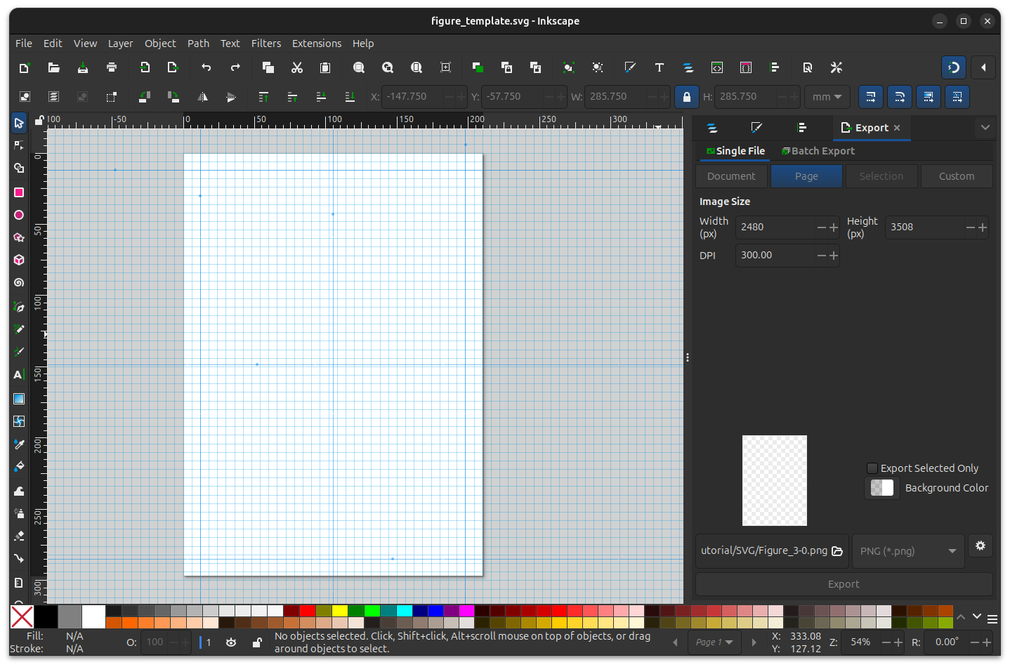 SVG is a vector graphic format that can be loaded and processed in Inkscape. We have prepared a figure template based on an A4 page that includes guides to leave page margins: figure_template.svg