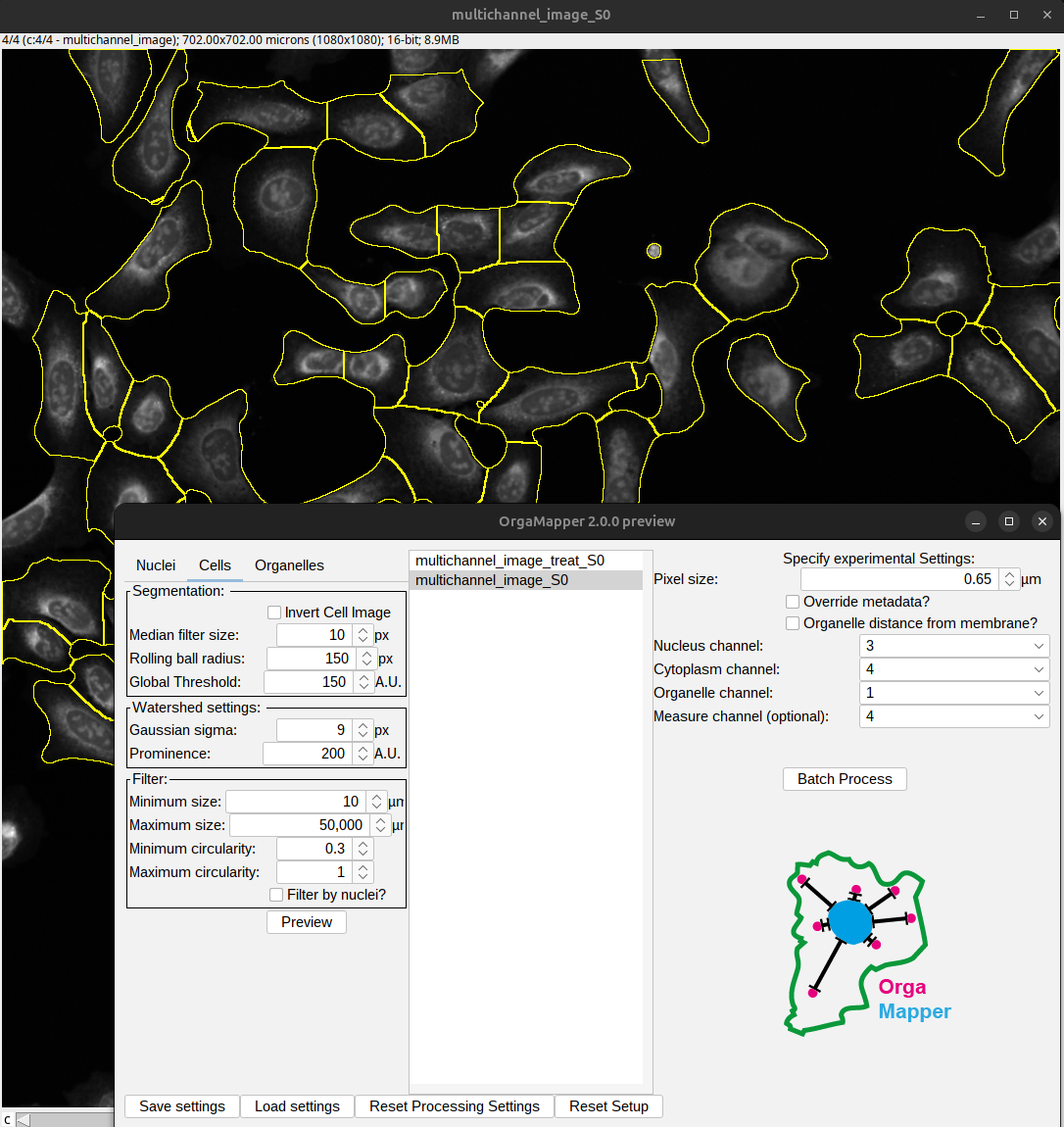 OrgaMapper then allows you to perform a simple watershed-based image segmentation and perform a basic analysis of each cell over the control and treatment. For more information about the analysis performed, you can go to the documentation of OrgaMapper.