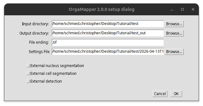 Specify the location of the input folder, output folder, and the settings file. Then press ok to start OrgaMapper.